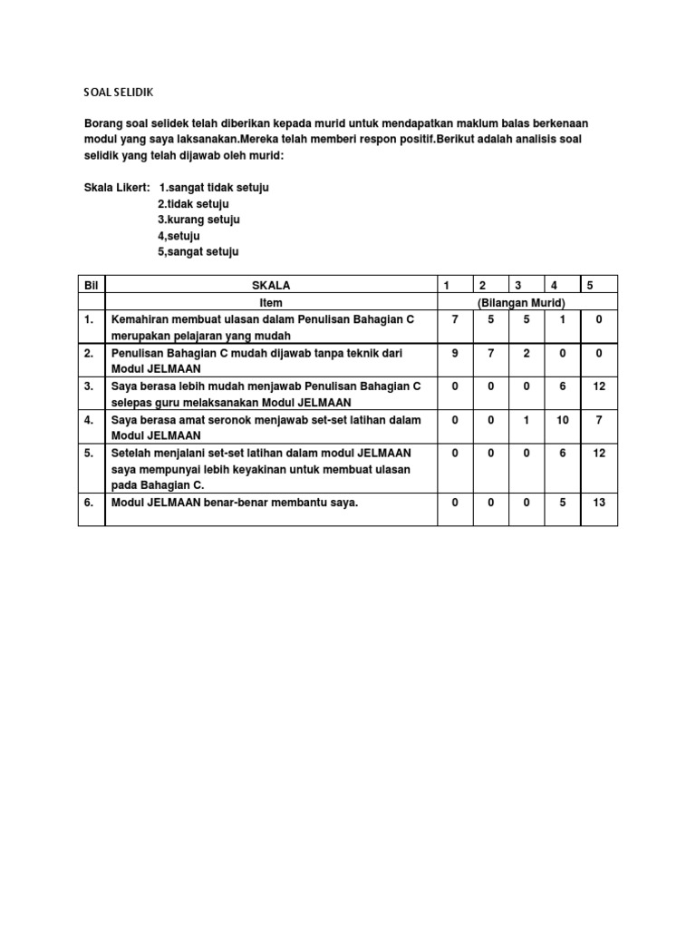 Jadi skala likert 7 mata adalah sama dengan skala 5 poin tetapi pilihan. Soal selidik ini bertujuan untuk mengkaji penggunaan sains dan teknologi dalam penghasilan biskut tradisional Heong Peah di Kampung Valdor Sungai Jawi Pulau Pinang. Penggunaan penanda wacana dalam struktur ayat penulisan karangan melalui ujian karangan naratif deskriptif dan eksposisi.