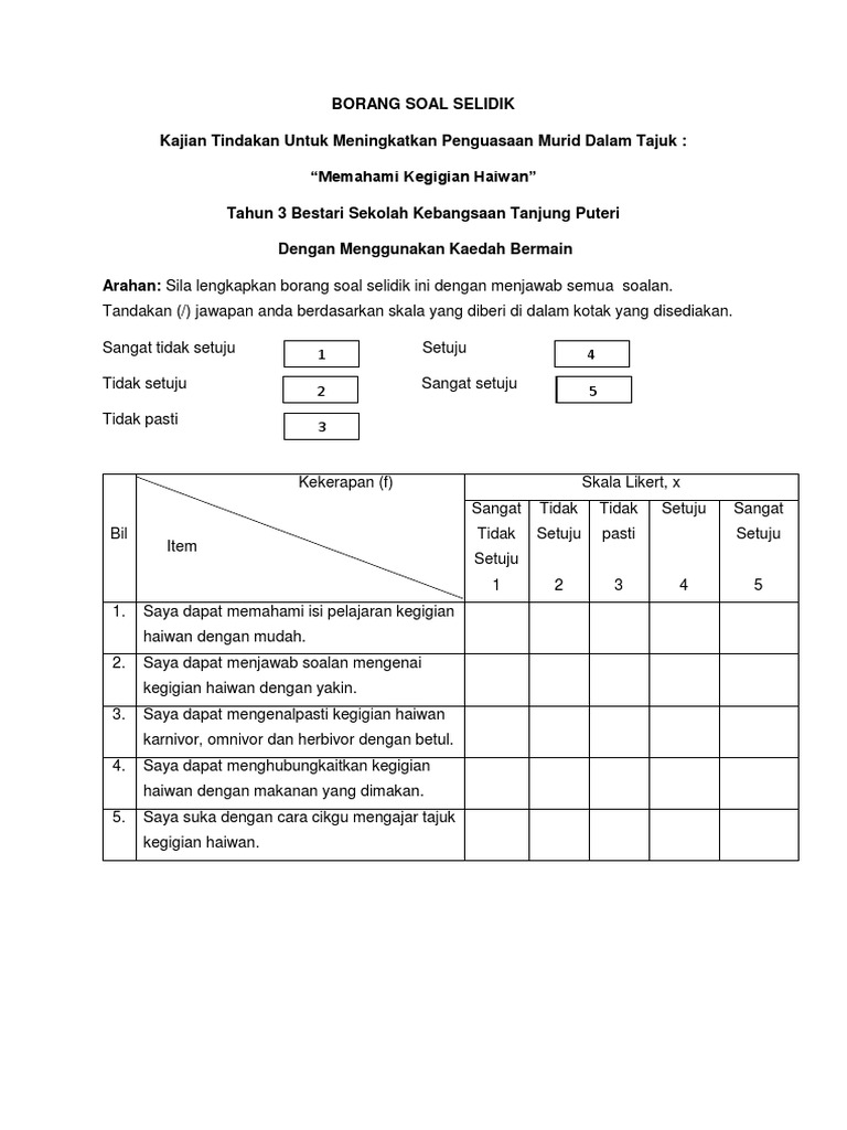 Contoh borang soal selidik skala likert 5 mata. 4 dalam soal selidik bahagian b. Pengertian skala likert dan cara menggunakan skala likert adalah skala penelitian yang digunakan untuk.